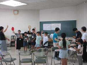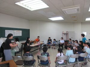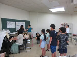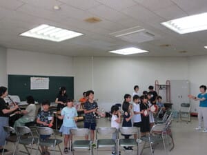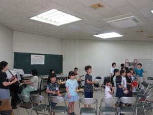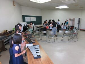 小学生の音楽クラブ第2回目を開催しました。暑いですが子ども達は元気いっぱいです。ハンドベルで「七夕」を演奏しました。1回目でも演奏したハンドベルです。とても上手にできました。「さんぽ」を合奏したり、「にじ」を歌と打楽器で演奏しました。